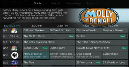 From the Program Guide, press the back button on your remote to open the Tab Bar. The Tab Bar allows you to scroll